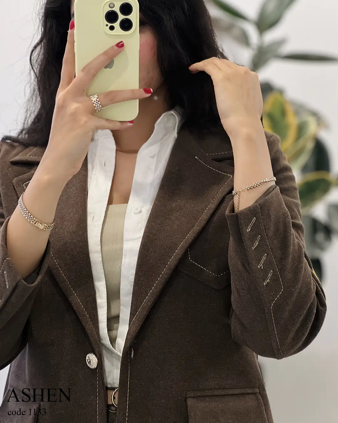 سبک کار مزونی ، پالتو کتی ، یقه بلیزر ، رو دوخت شده ، یه جیب رو سینه کار شده دو تا برگه جیب فیلتاپی پایین کار ، جلو دگمه میخوره بسته میشه ، پشت کار ساسون خورده گودی گرفته شده ، داخل کار تمام آستر کشی شده ،